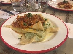 Raviolone di ricotta e cavolo nero con ragu di Coniglio al vino
