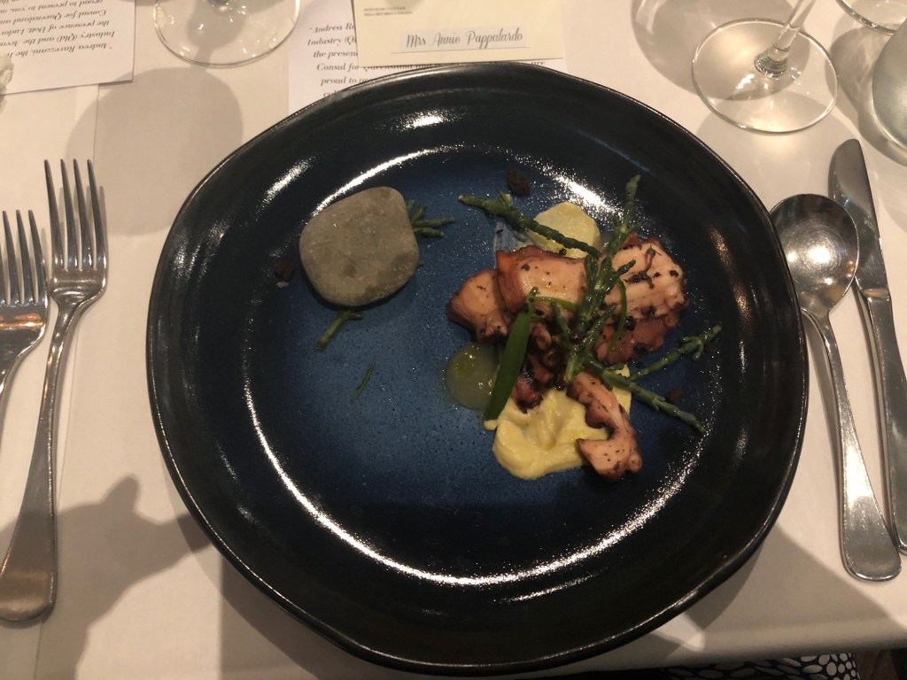 Octopus hand, sea vegetable, pancetta gel, pickled shallots, taggiasca olive powder
